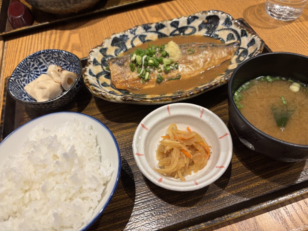 私はさばの味噌煮定食、Mさんは若鶏と茄子の柚子おろし煮定食を注文!
